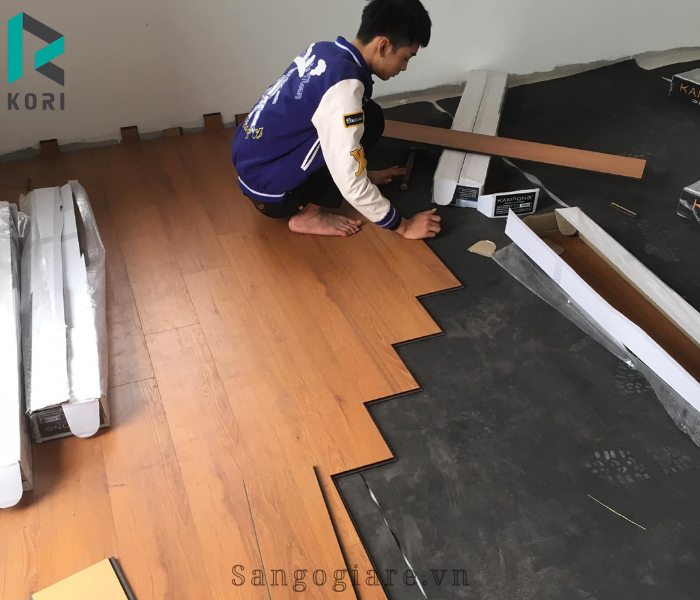 Bước 1: Đo đạc diện tích phòng và cắt các tấm sàn theo kích thước phù hợp, đảm bảo để khe hở 8-10mm dọc theo tường để sàn có không gian giãn nở tự nhiên.